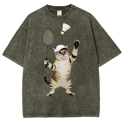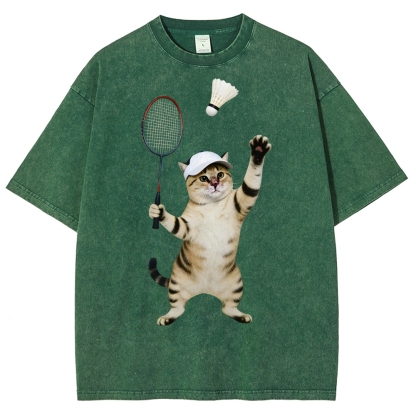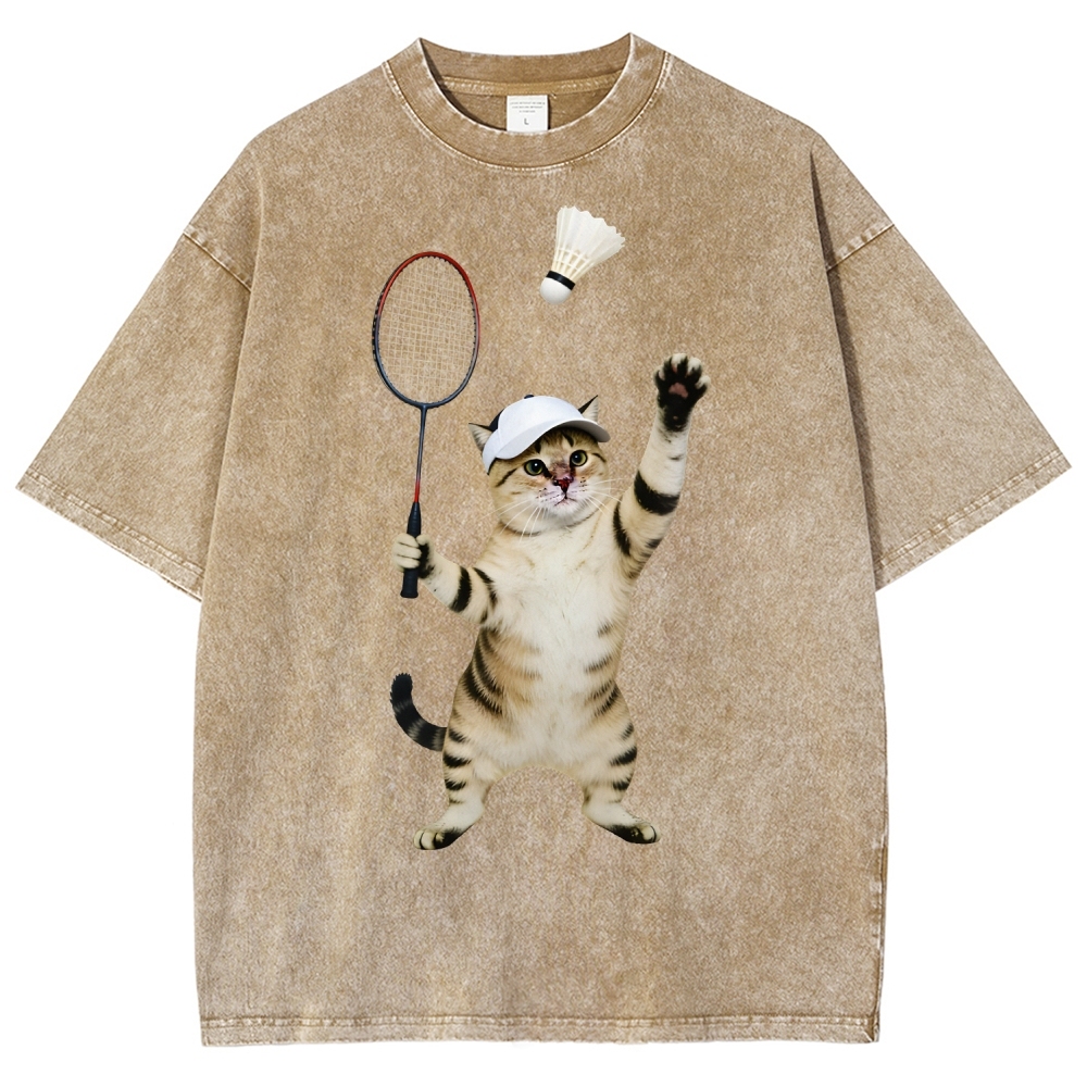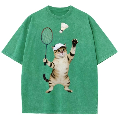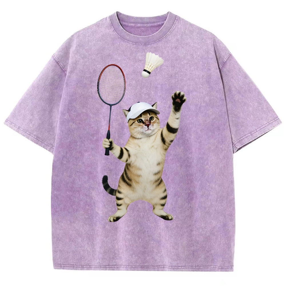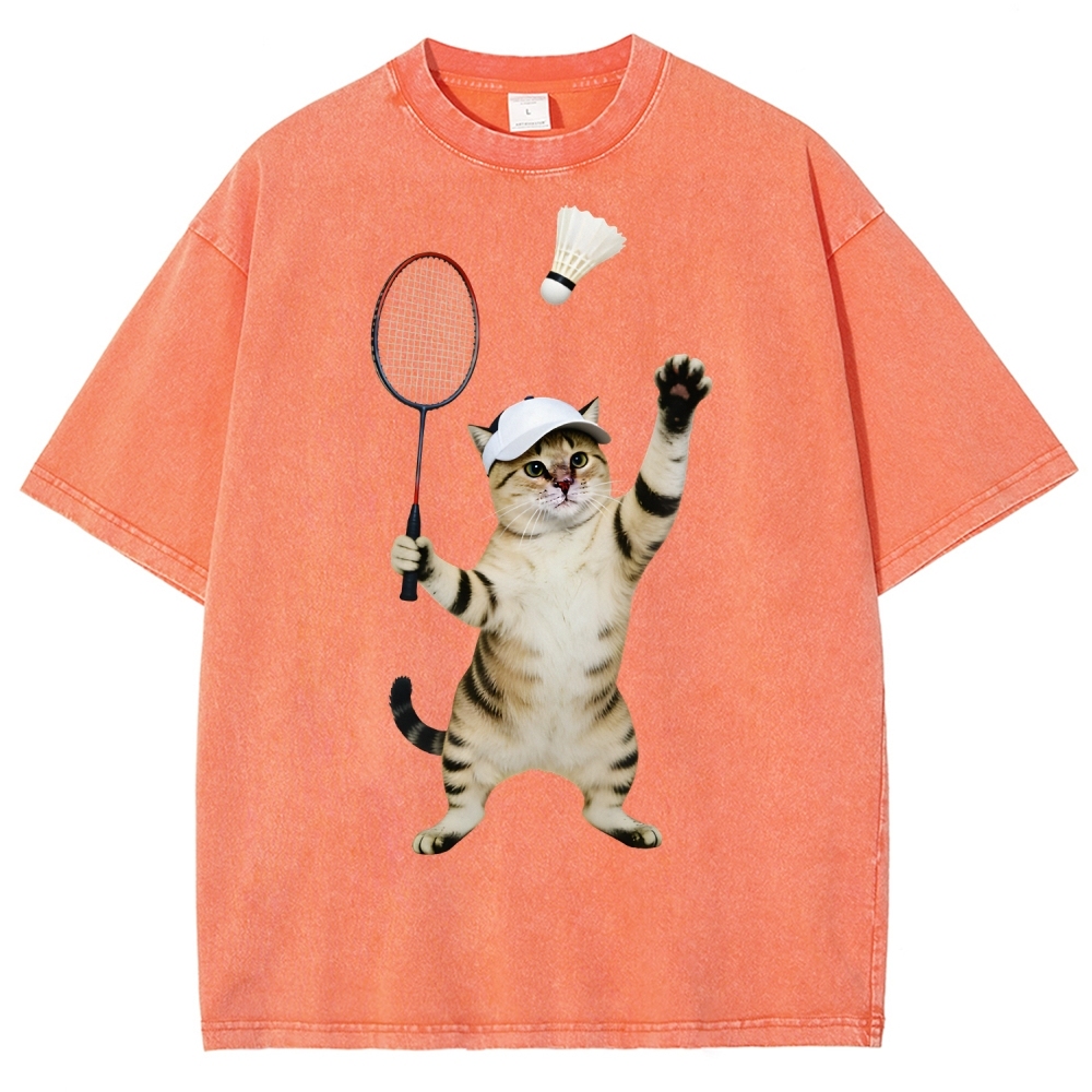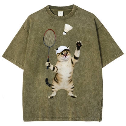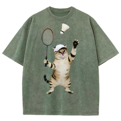 Badminton Player Cat Unisex Fit Washed T-Shirt