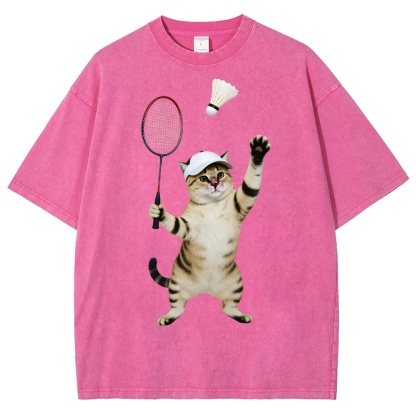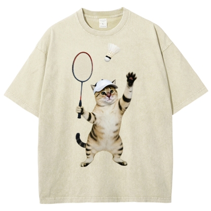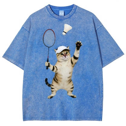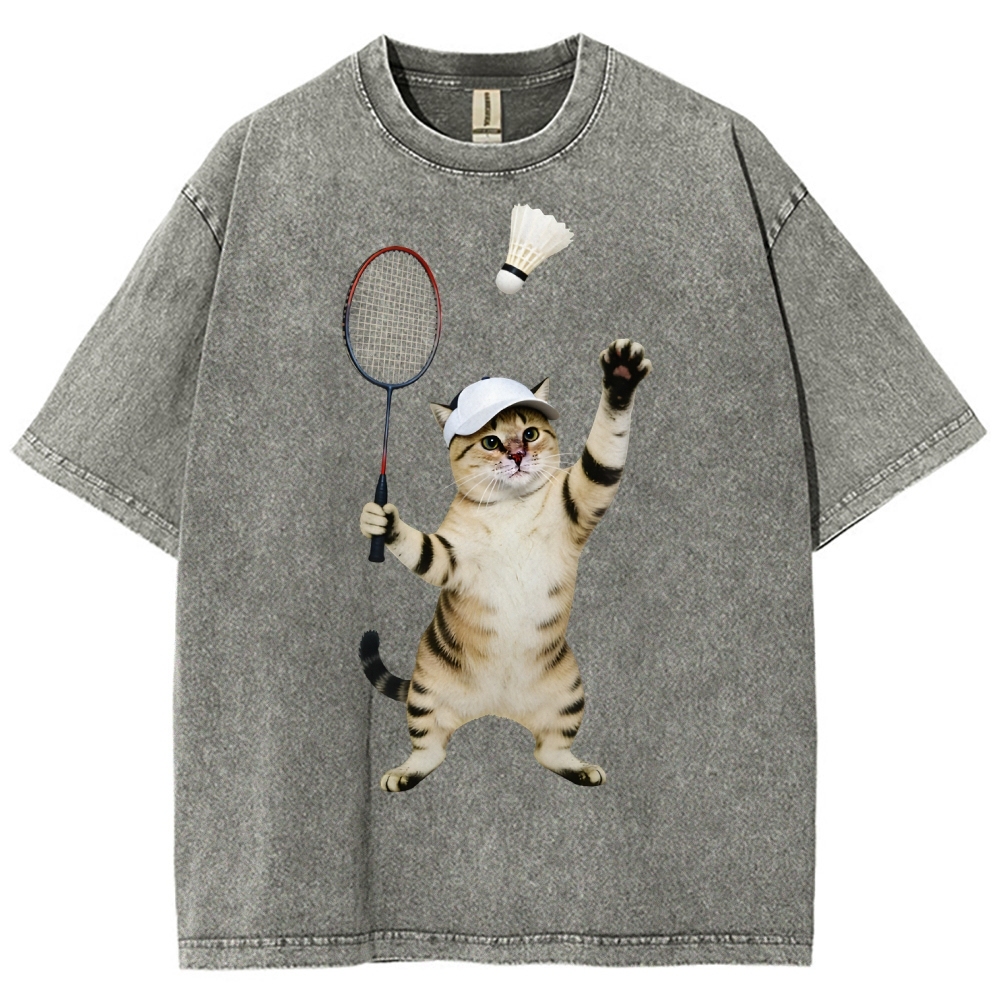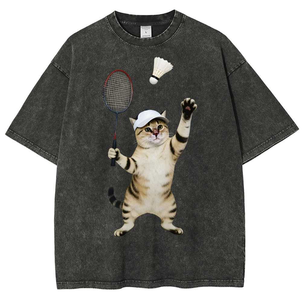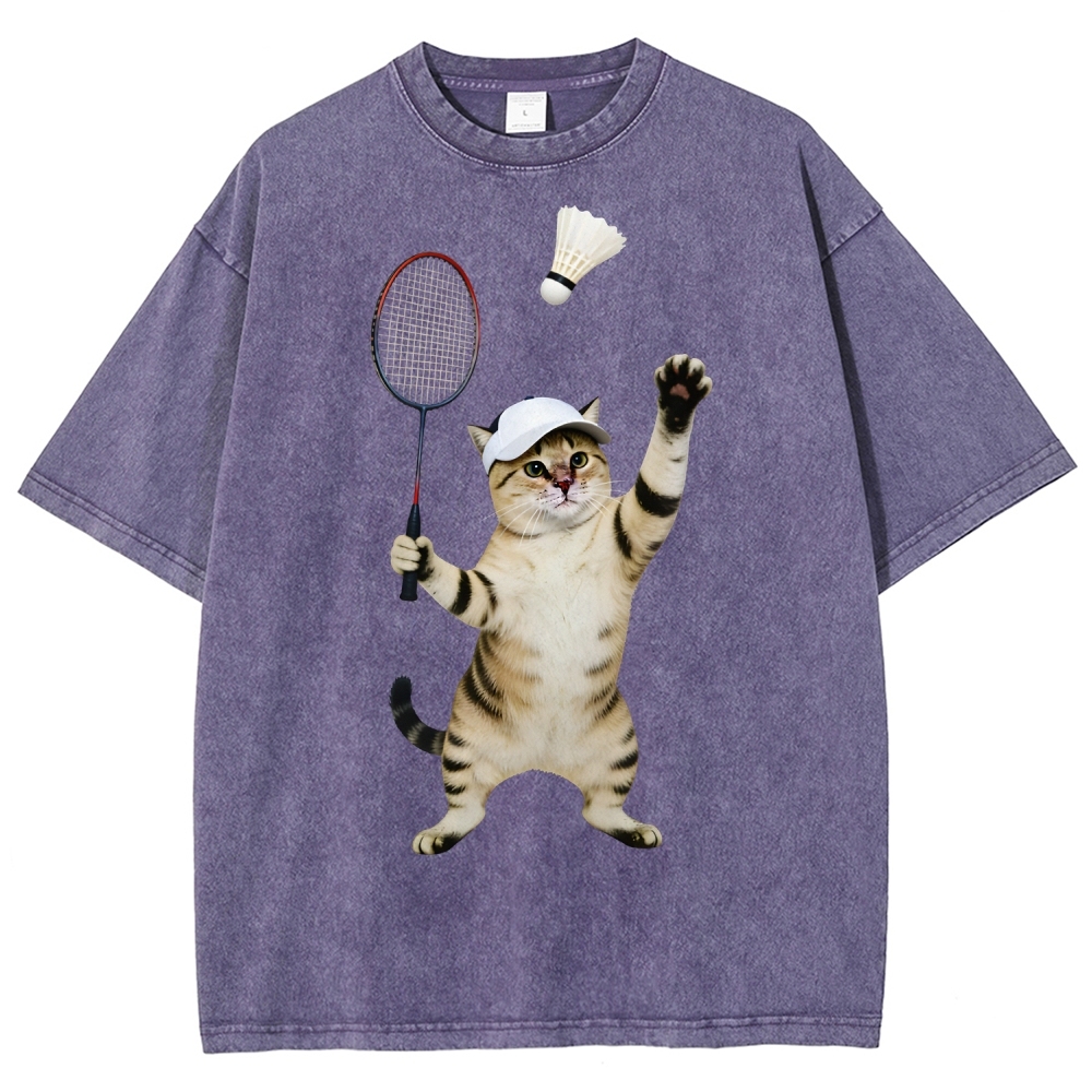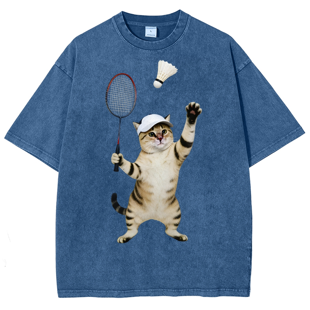 Badminton Player Cat Unisex Fit Washed T-Shirt