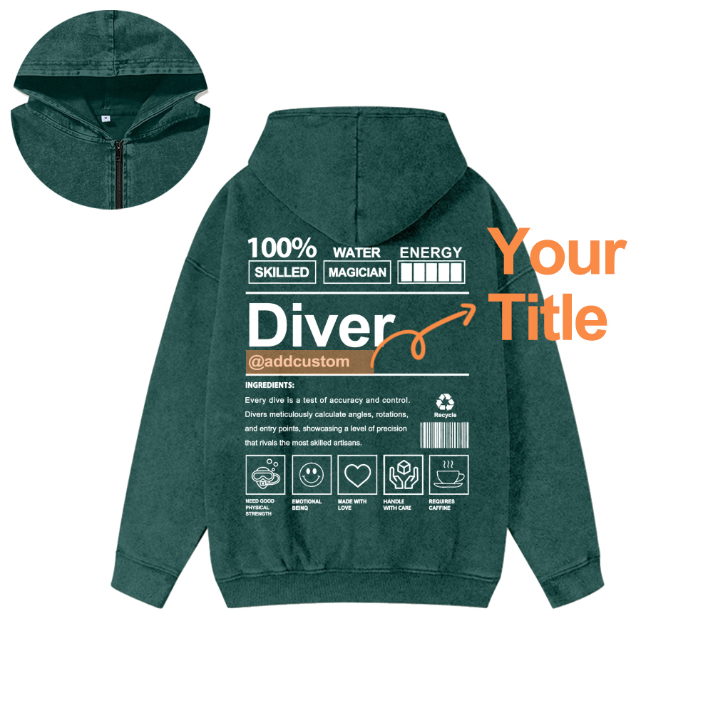 Diver Custom Unisex Washed Cotton Zipper Hooded Sweatshirt