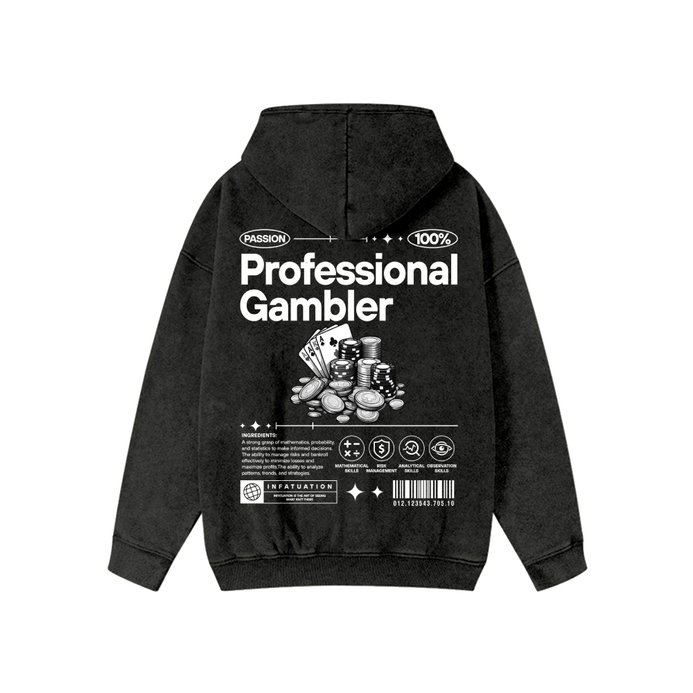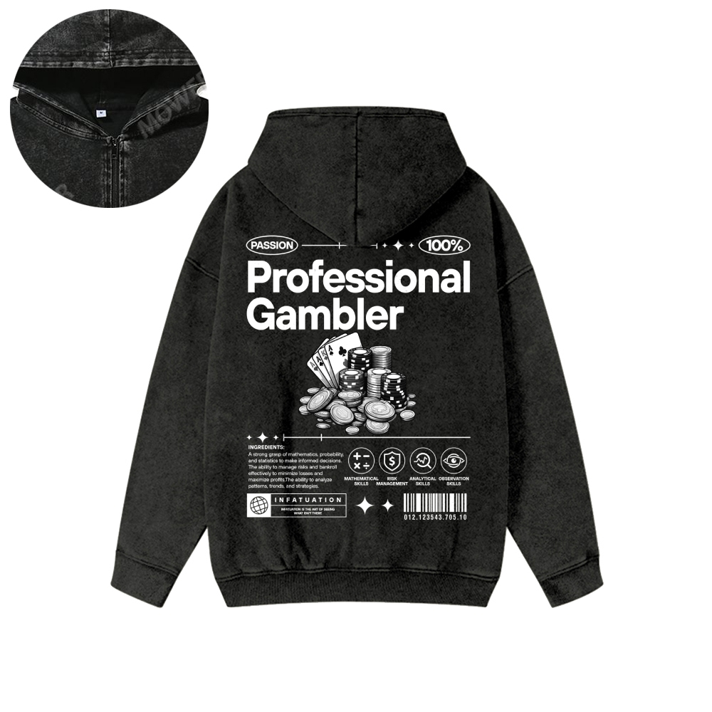 Professional Gambler Unisex Washed Cotton Zipper Hooded Sweatshirt
