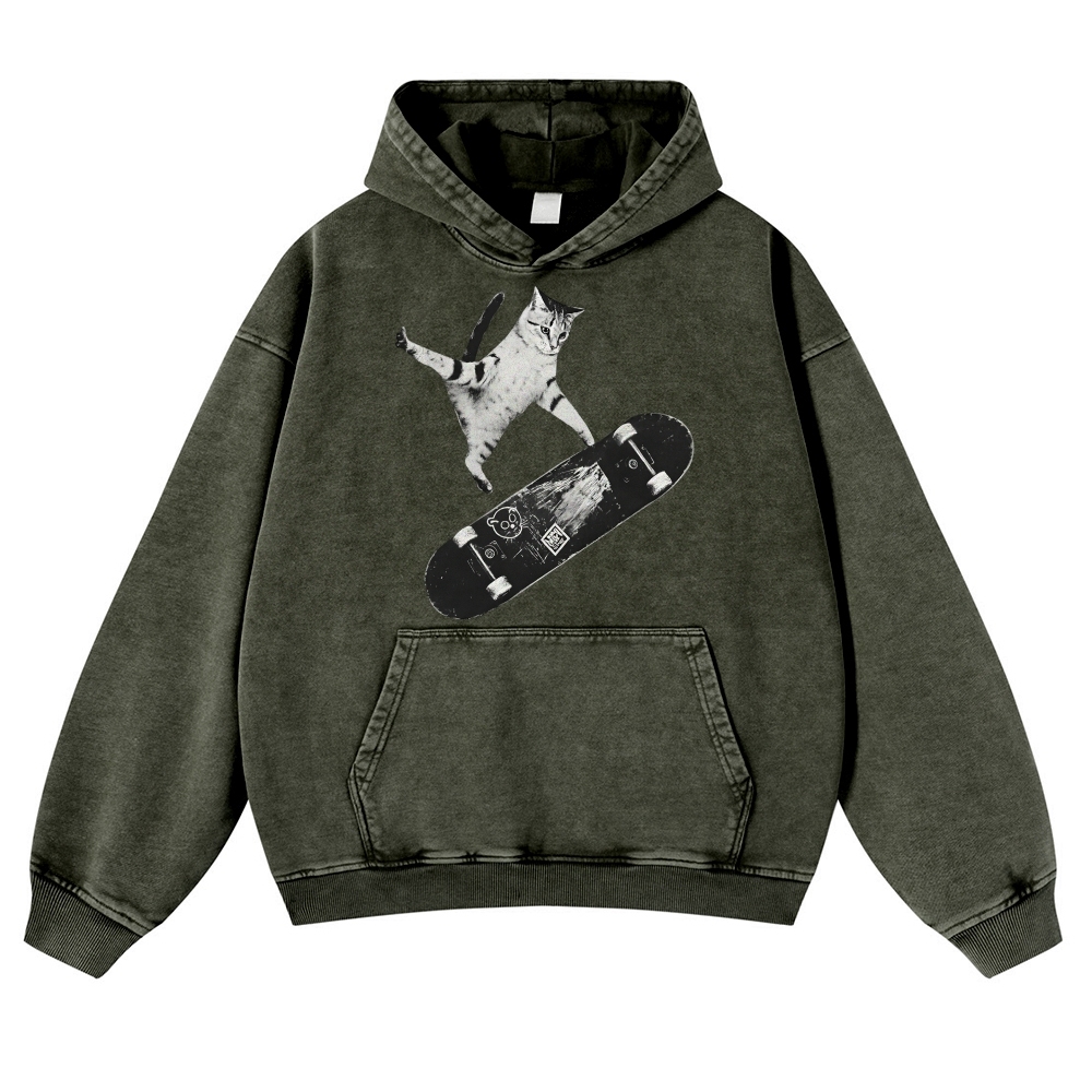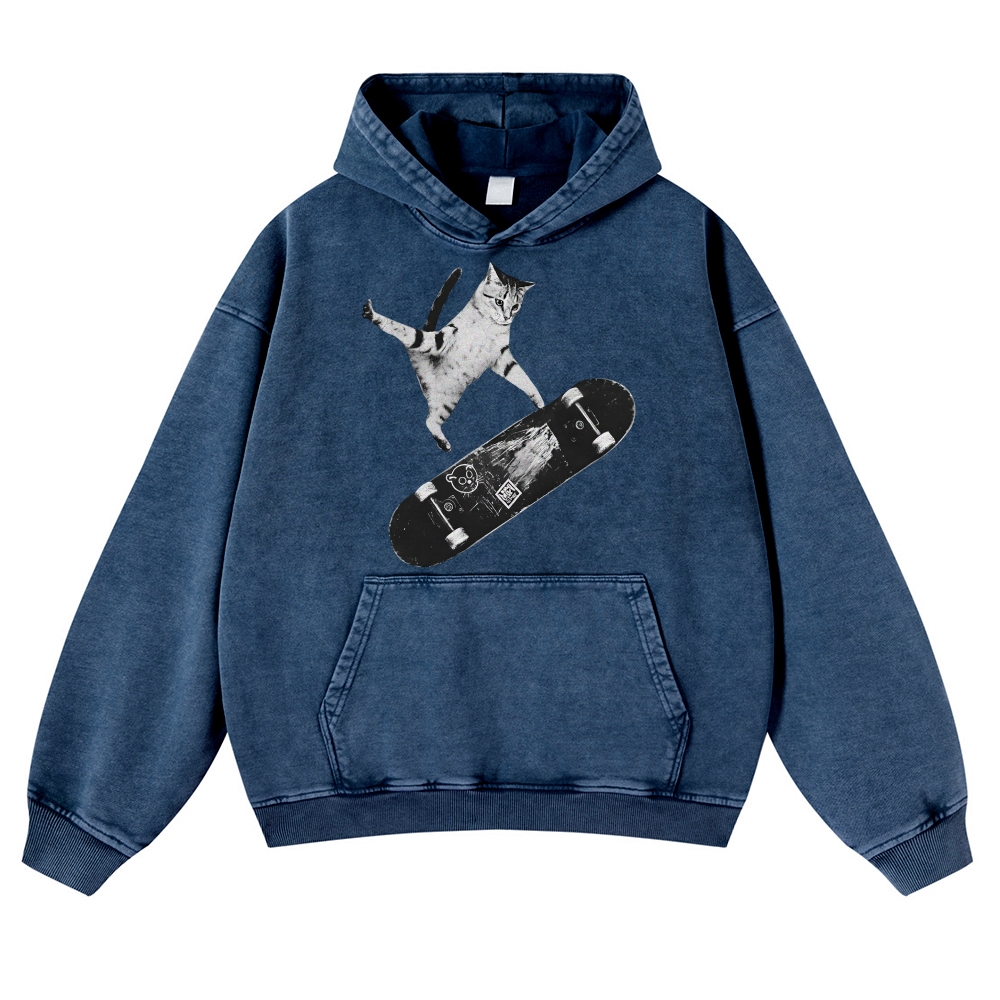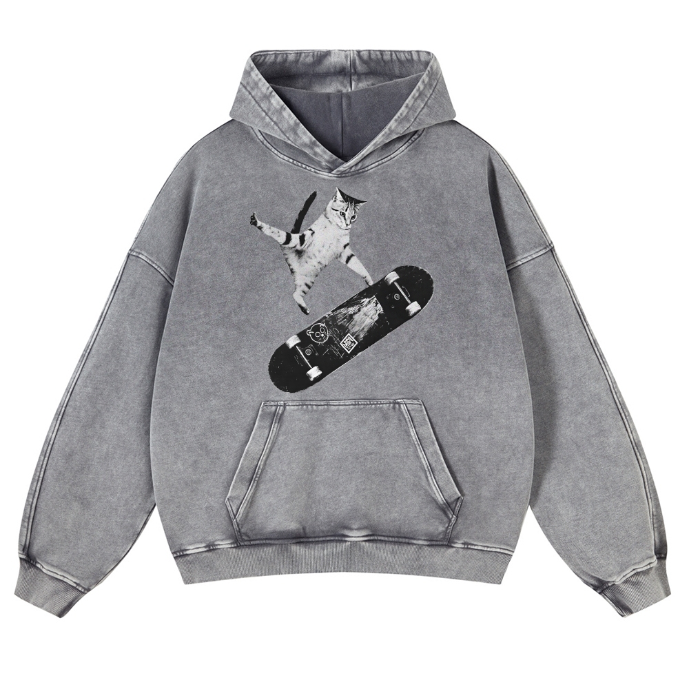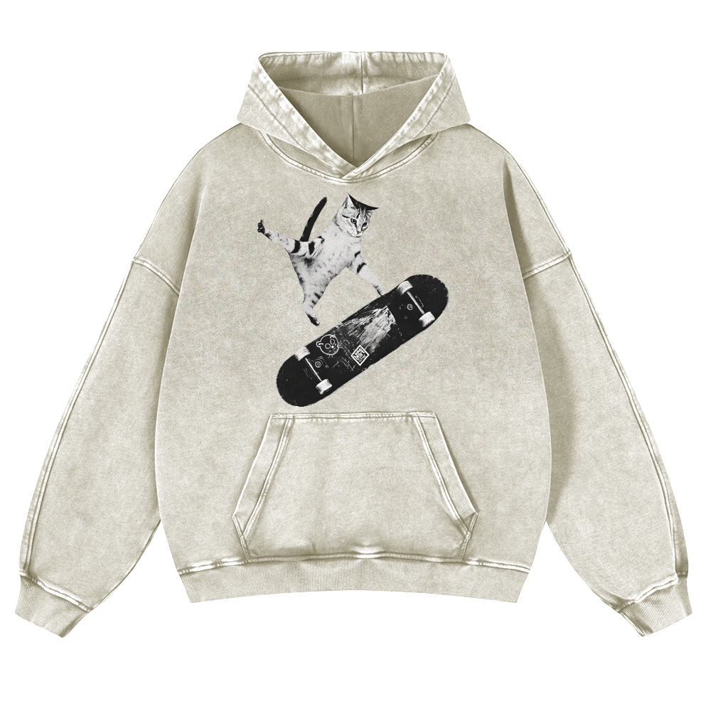 Skater Cat Black & White Unisex Fit Vintage Washed Hoodie