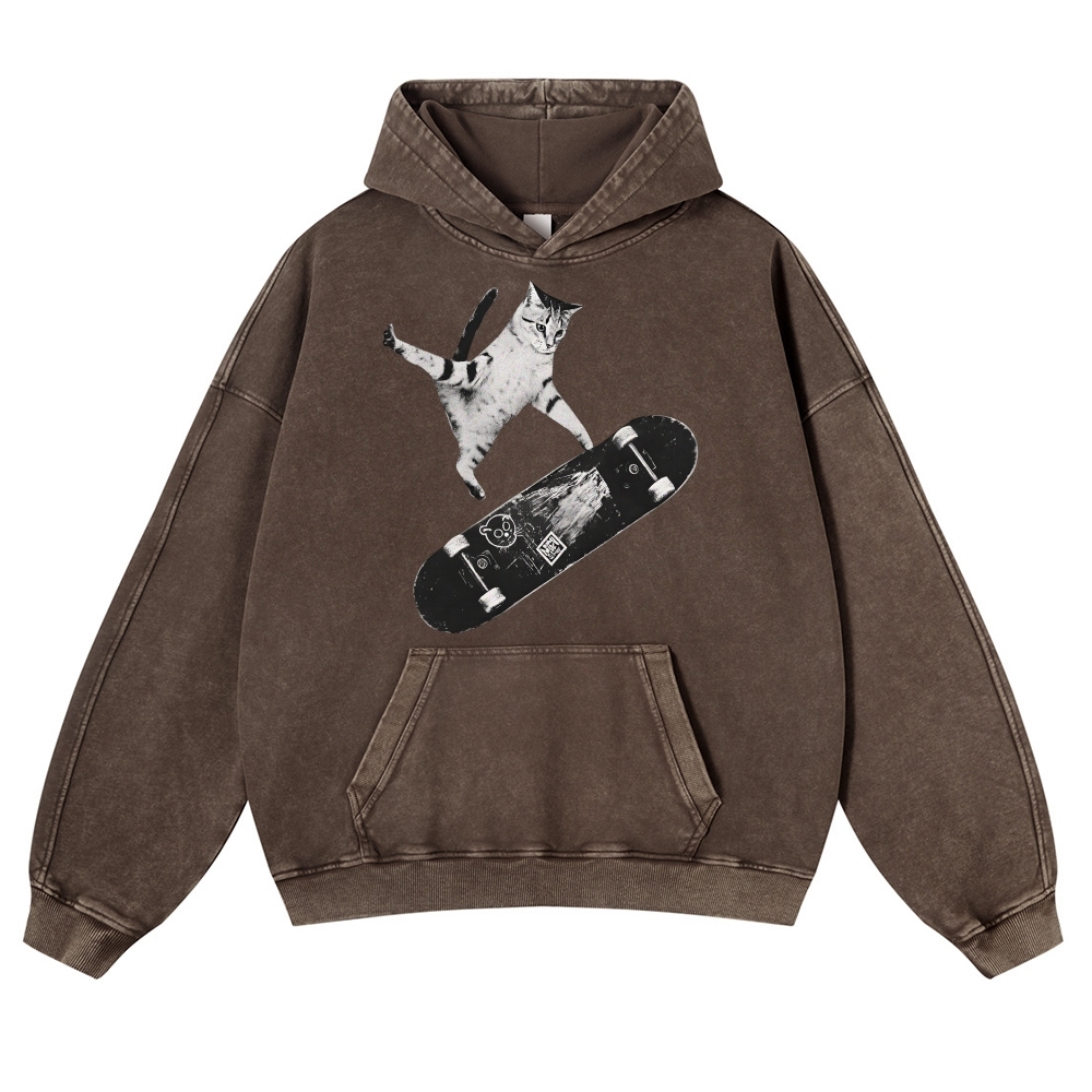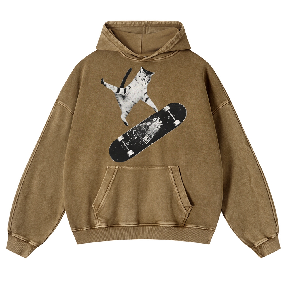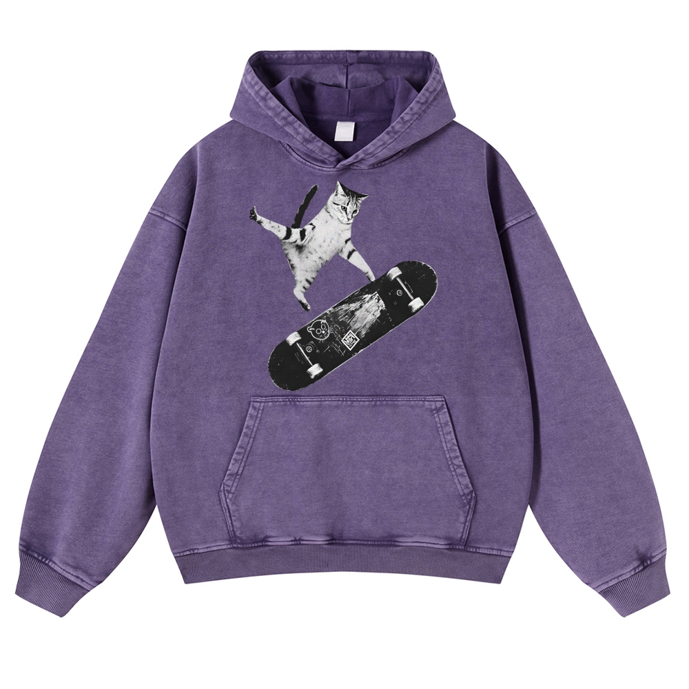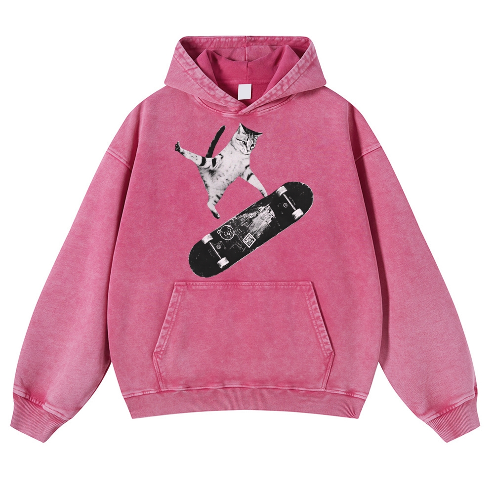 Skater Cat Black & White Unisex Fit Vintage Washed Hoodie