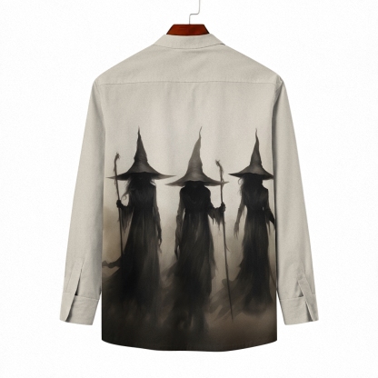 Unisex Fit Vintage Witch Halloween Prints Long Sleeves Stand-Up Collar Shirt (With Pockets)