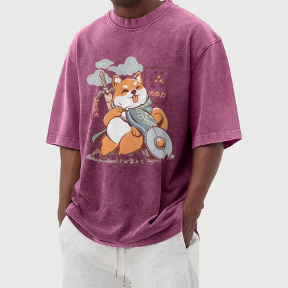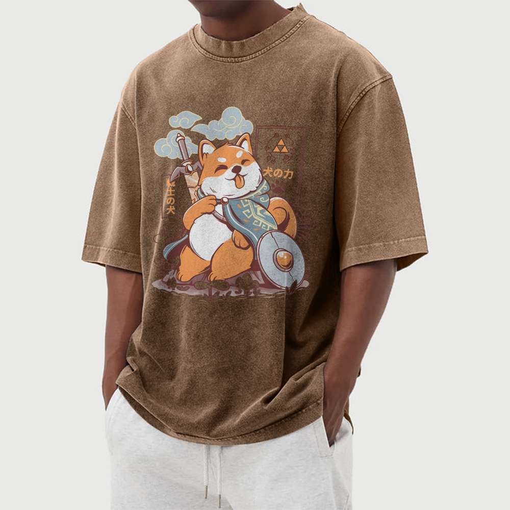 Warrior Dog Pattern Washed Vintage Short Sleeves T-Shirt